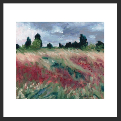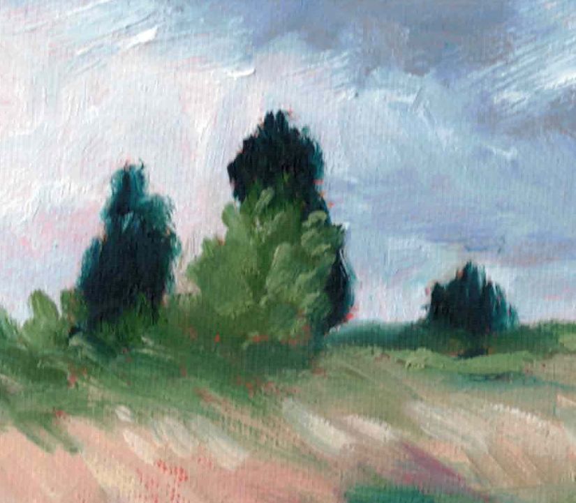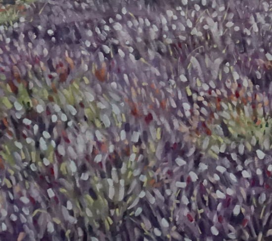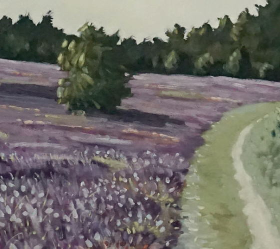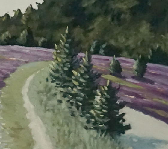 So windig muss es auch im Sommer 1975 gewesen sein, als die Heide zehn Tage lang unkontrolliert brannte. Andauernde Hitze von über 30 Grad und eine geringe Lufttemperatur ließen die Landschaft in bis zu 20 Meter hohe Flammen aufgehen. In diesem Sommer also 2025, Gott sei Dank, war es eher kühl und nur an wenigen Tagen hatten wir die Freude über Temperaturen von 25 bis 27 Grad. Trotz Wind und Wetter entstand dieses kleine Schmuckstück vom Wilseder Berg und zeigt die Farbenpracht der Heide in Öl auf 30x30cm.