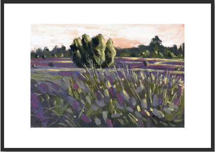 Die Heide wird hier in voller Blüte dargestellt und läd den Betrachter ein, die Seele baumeln zu lassen. Der Heideweg schlängelt sich durch die Landschaft in Richtung Undeloh. Die Farben leuchten und die Sonne taucht die Szene in ein warmes Licht. Hier steht die Zeit still und man kann das Summen der Bienen hören. Ein Ort der Ruhe und Erholung, der zum Verweilen und Träumen einlädt.