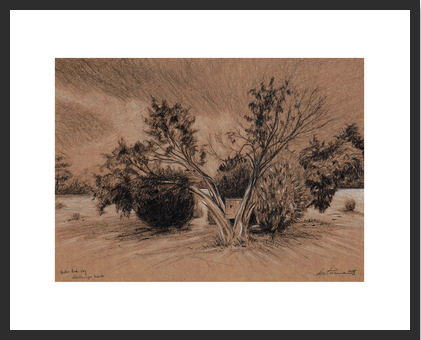 Diese Kohlezeichnung zeigt die vielfältigen Strukturen, die typischen Weggabelungen, die vielen anderen Pflanzen und die Weite des Himmels der Heide.