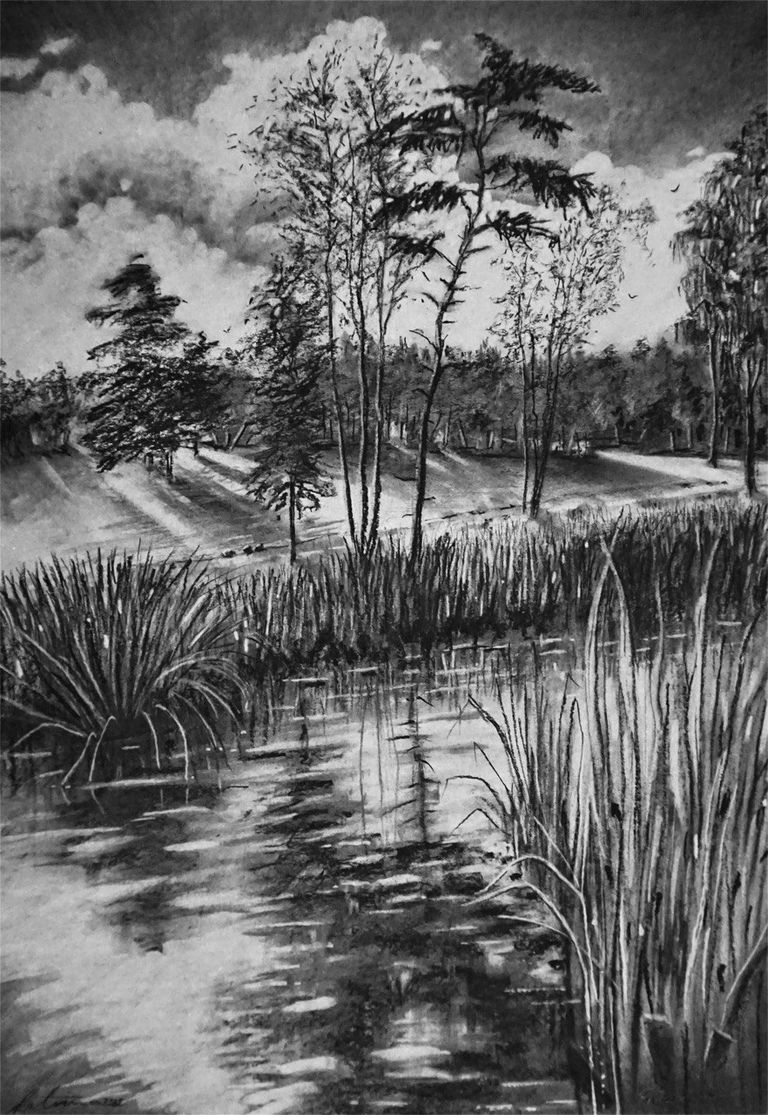 Wie in dieser Zeichnung sieht man, dass das Piezmoor den Malern und Zeichnern hervorragende, abwechslungs- und detailreiche Motive durch seine Wasserflächen in denen sich die Landschaft wiederspiegeln kann, liefert.